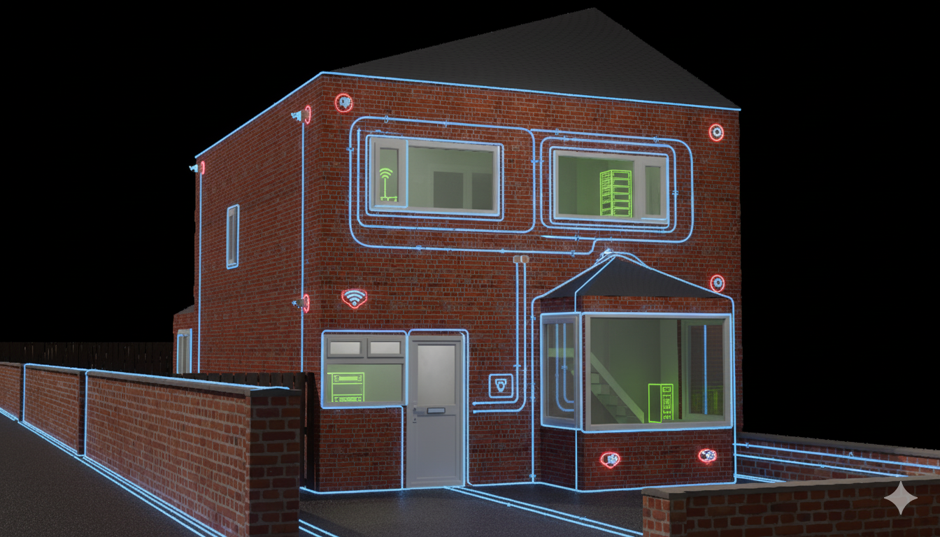 Now, you might be thinking, “Jim, isn’t a 2D floorplan enough?” And technically, yes, but where is the fun in that? Building the 3D model lets me visualise the space properly, figure out line-of-sight for Wi-Fi (the irony is not lost on me), and, most critically, map out exactly where the cables are going. When you’re dealing with properties where every internal wall is thick, dense brick—the kind of brick that seems designed by engineers purely to thwart Wi-Fi signals—you need to know if that 30-50mm wall is going to cause a problem. Plus, creating a digital twin means I can virtually rip out walls and relocate sockets before I even buy the first tin of paint. It’s truly pure gold for my high-functioning planning anxiety.